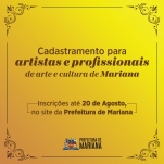 A Secretaria de Cultura, Patrimônio Histórico, Turismo Esporte e Lazer, informa que está aberto o cadastro de Artistas e Profissionais de Arte e Cultura marianenses. O cadastro poderá permitir a formalização de parcerias com a Secretaria, e a prestação de serviços ao município, valorizando, acima de tudo, a fomentação da cultura local.