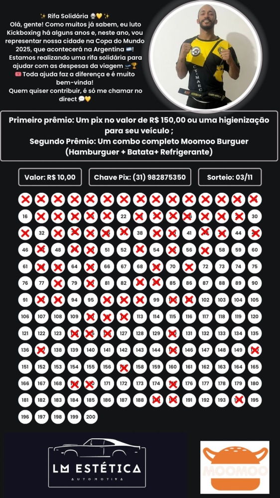 Para tornar possível a viagem e a participação no campeonato mundial, o atleta está promovendo uma rifa solidária, cujo valor arrecadado será destinado aos custos de transporte, hospedagem e alimentação durante o evento.