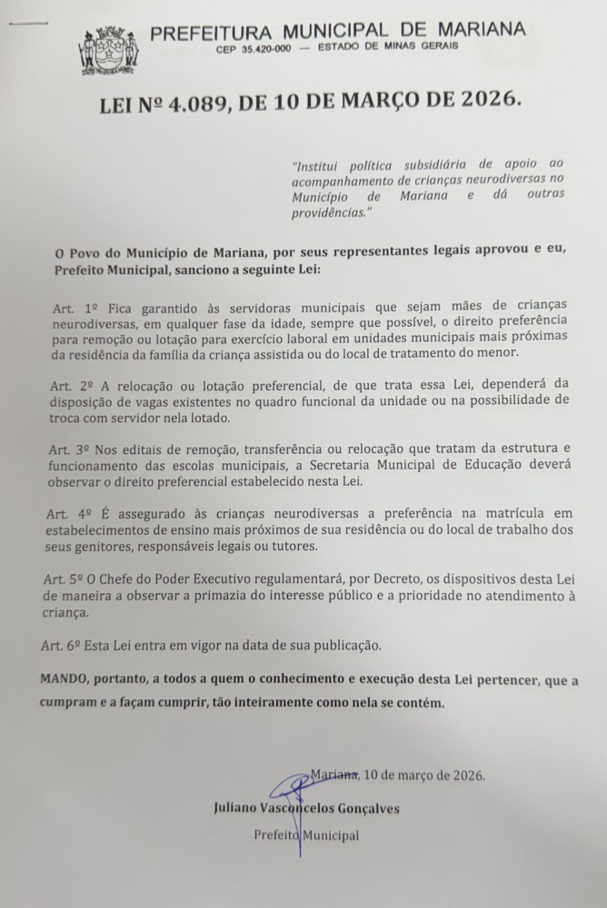 A Prefeitura de Mariana aprovou a Lei nº 4.089, que estabelece uma política subsidiária de apoio ao acompanhamento de crianças neurodiversas no município. A assinatura do documento também foi realizada no dia 10 de março, e a legislação foi oficialmente sancionada no Diário Oficial do município.