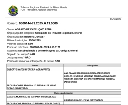O Ministério Público Eleitoral interpôs recurso especial ao Tribunal Superior Eleitoral (TSE) contra a decisão do Tribunal Regional Eleitoral de Minas Gerais (TRE-MG) que manteve o vereador Gilberto Mateus Pereira, conhecido como Tikim Matheus, no exercício do mandato. A manifestação do MP, assinada pelo Procurador Regional Eleitoral Tarcísio Henriques, foi protocolada no dia 4 de dezembro de 2025.